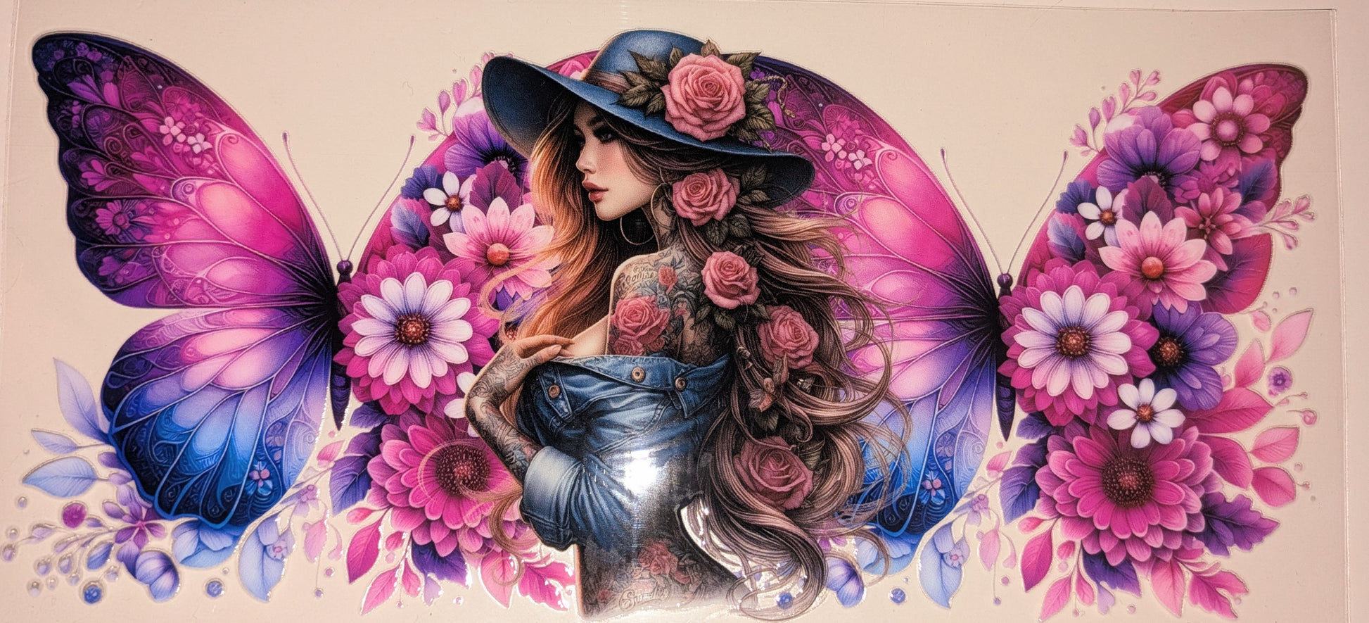 16 Oz Tattoogirl pink mit Jeansjacke mit Schmetterlingen CS000085