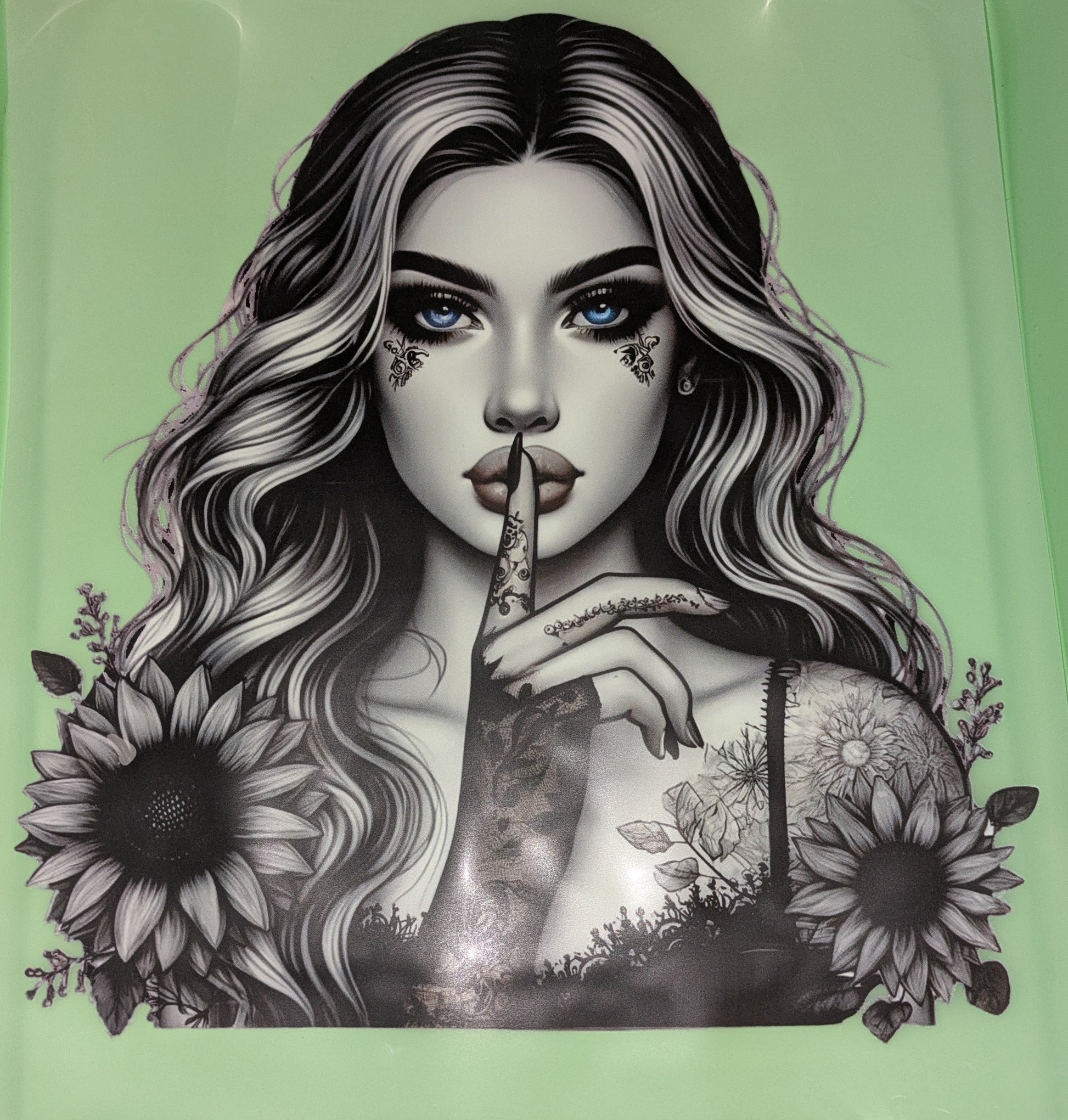 Bügelbild Gr. L " Tatoogirl Psst blaue Augen " GBB000026