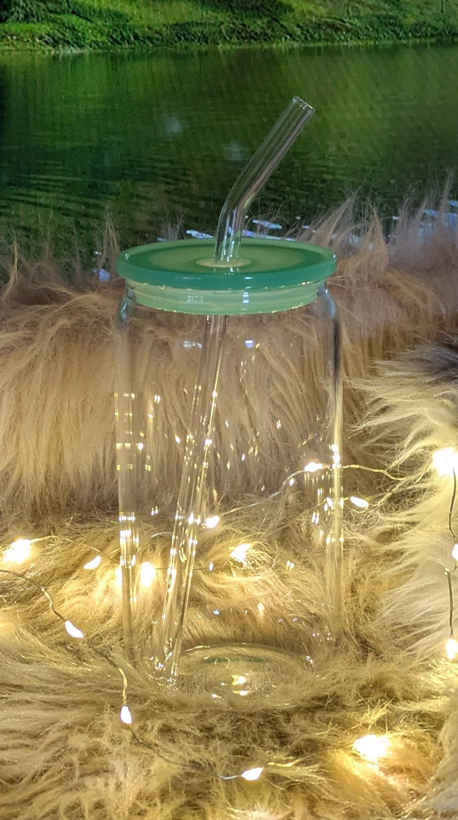 Glasbecher mit grünem Deckel und Trinkröhrchen + Sticker nach Wahl