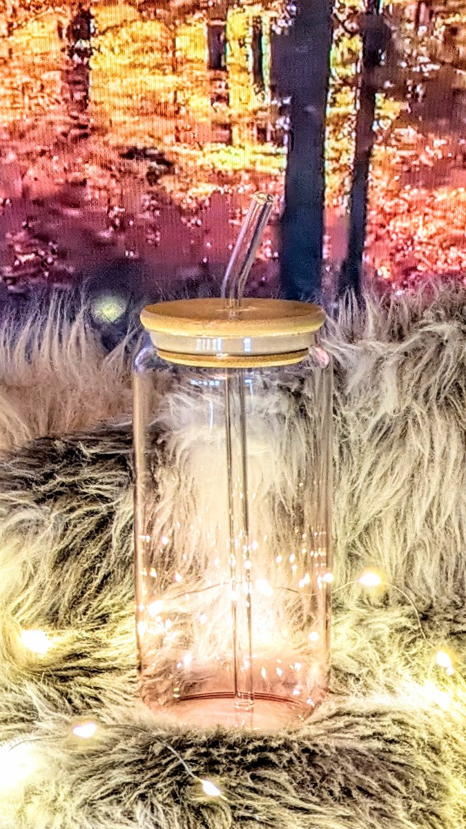 Glasbecher Pinker Farbverlauf mit Bambusdeckel und Trinkröhrchen + Sticker nach Wahl