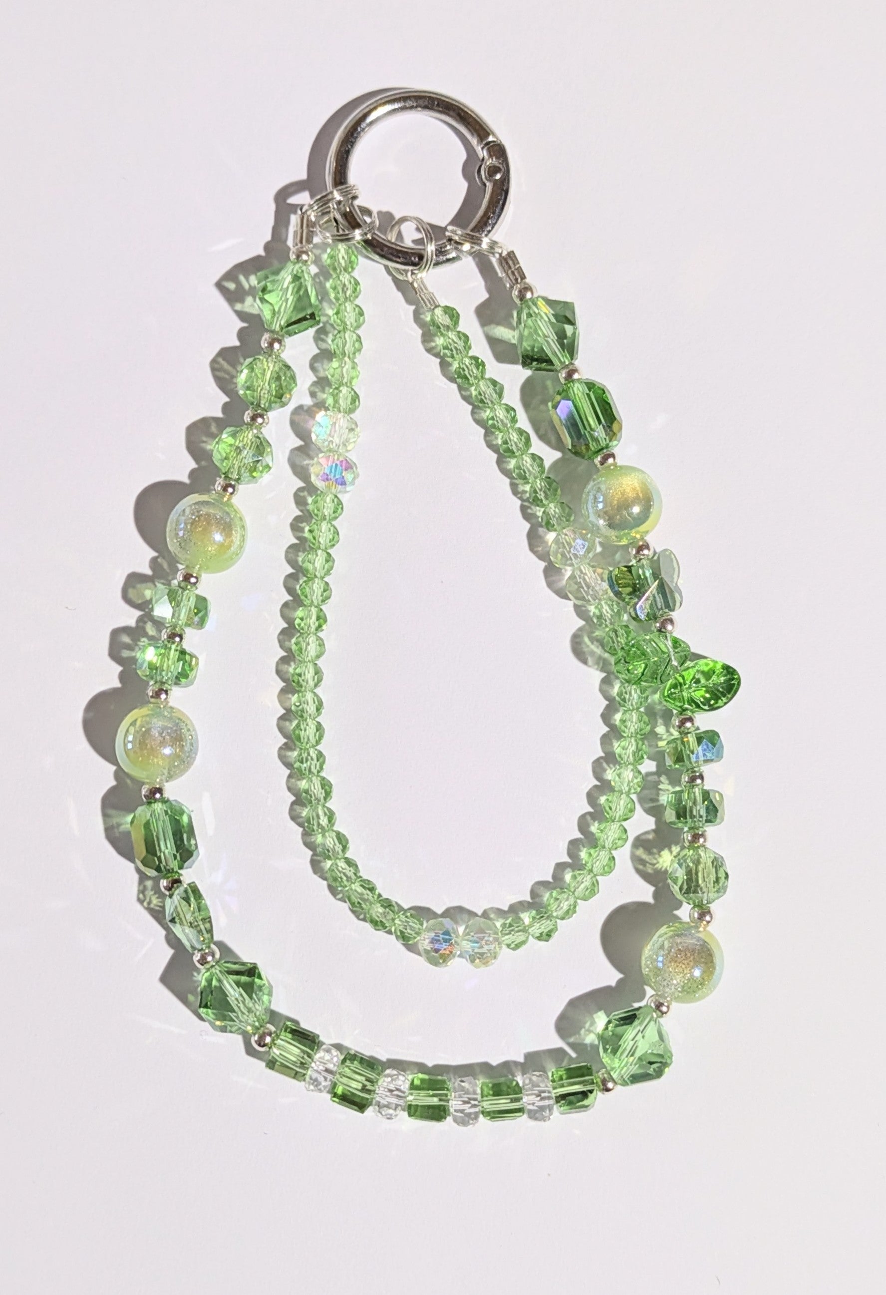 Hochwertige Elegante Doppelläufige Handykette aus Glas- und Metallperlen in grün
