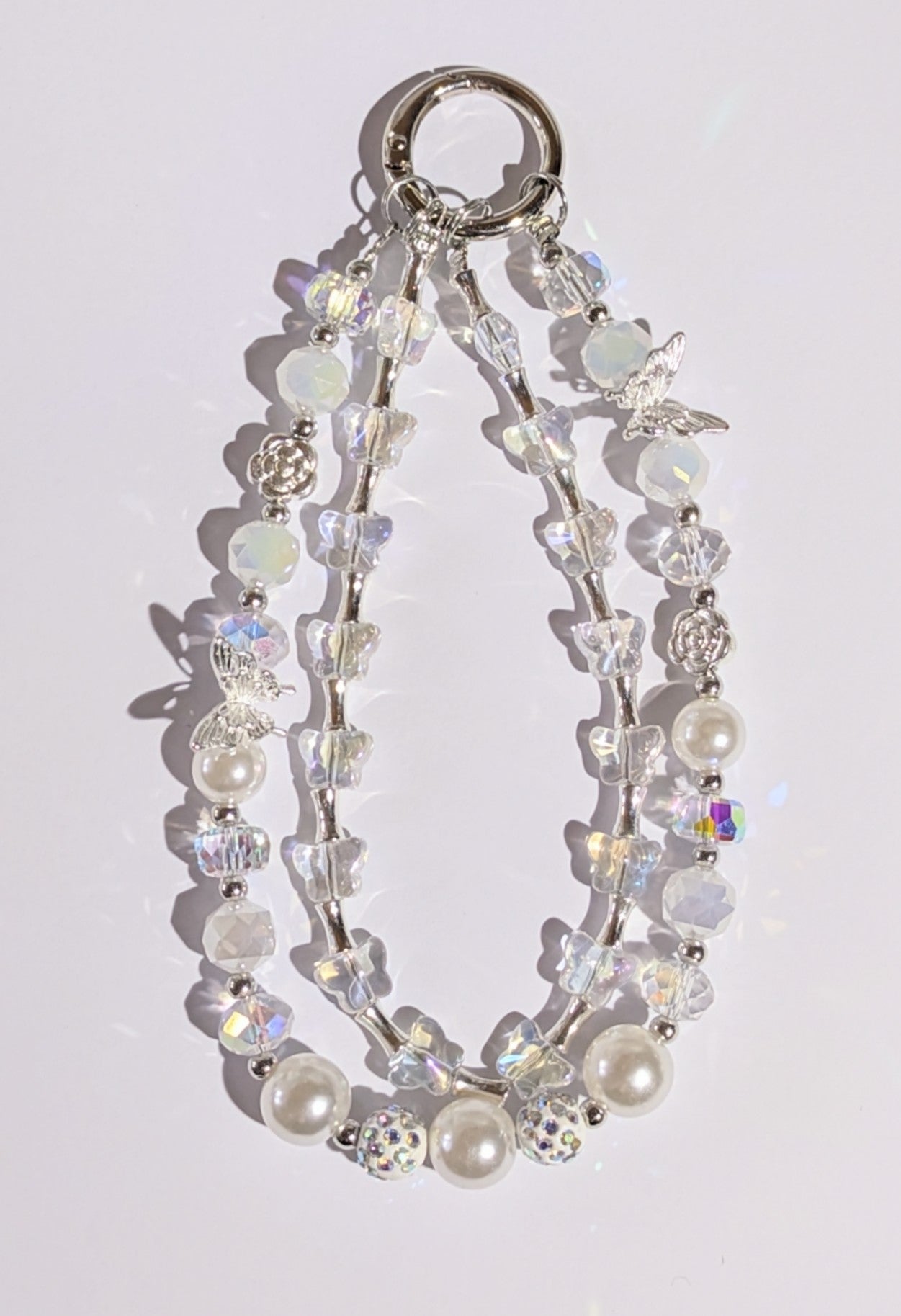 Hochwertige Elegante Doppelläufige Handykette aus Glas- und Metallperlen in weiß mit Schmetterlingen