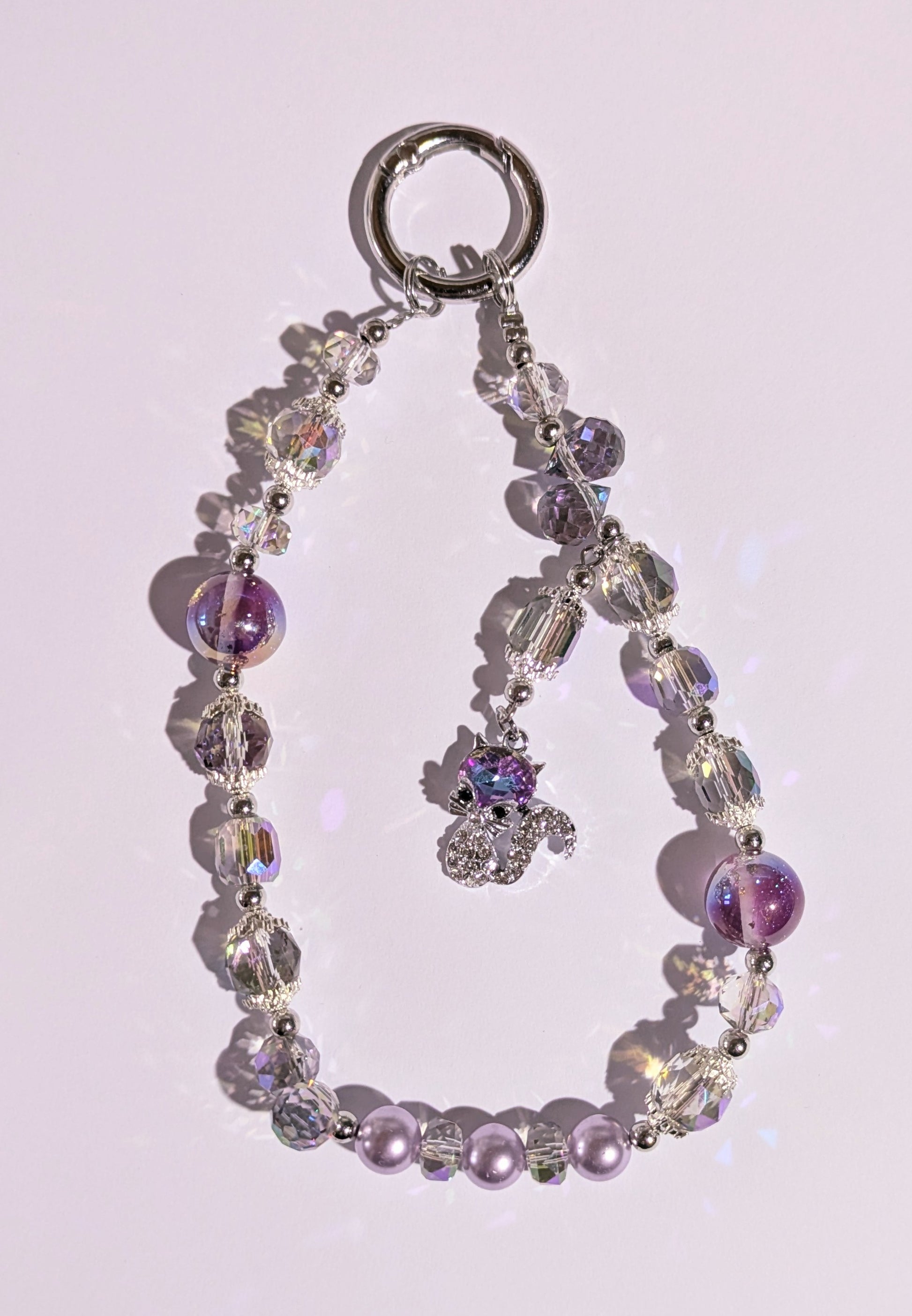 Hochwertige Handykette aus Glas- und Metallperlen in lila mit Metallkatzen Perle