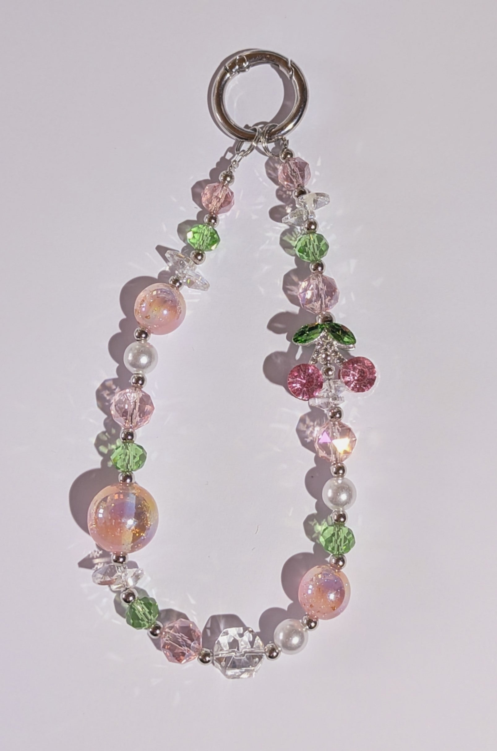 Hochwertige Handykette aus Glas- und Metallperlen in Rosa grün mit Kirschanhänger