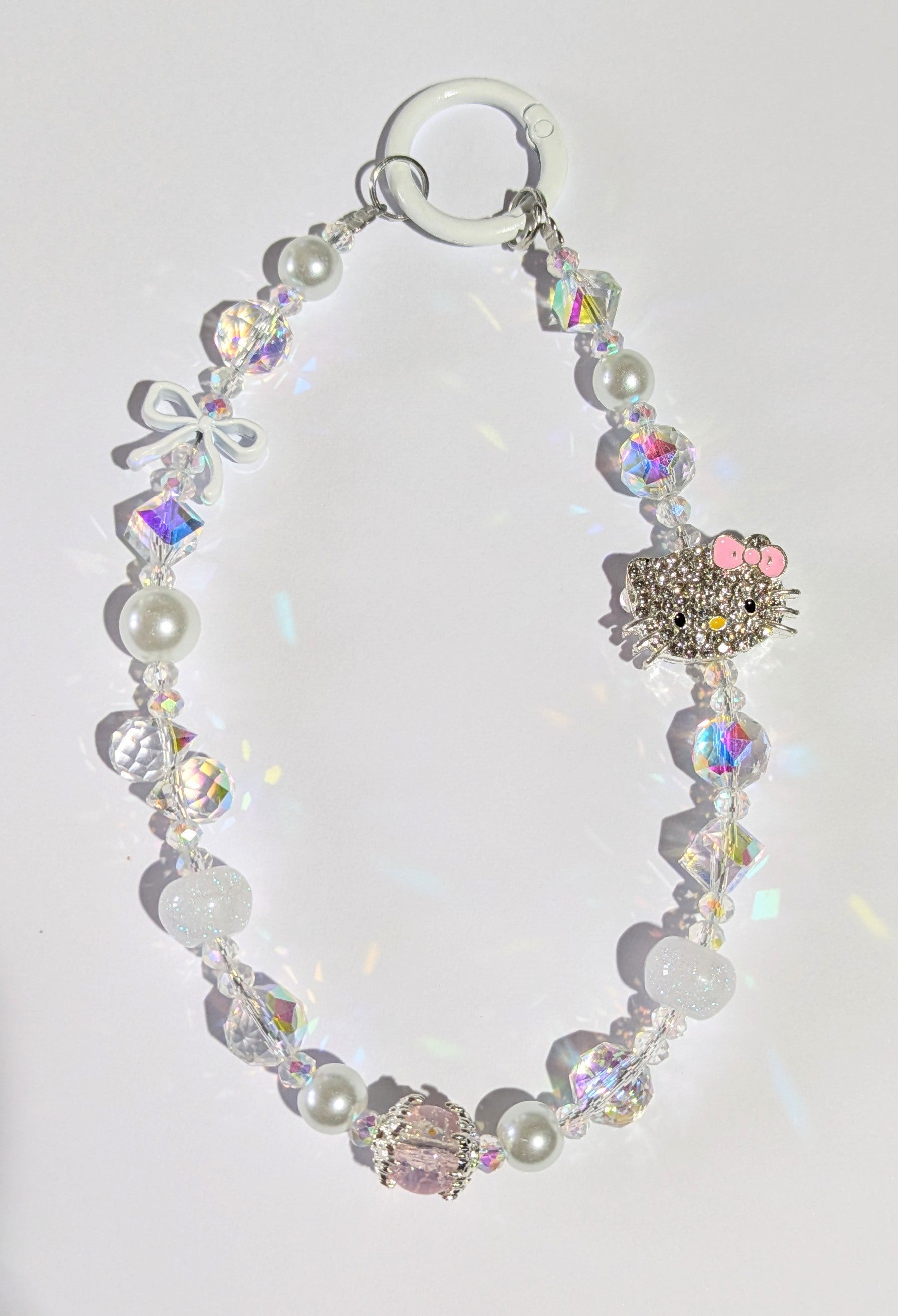 Hochwertige Handykette aus Glas- und Metallperlen mit großer HK Metall-Strassperle