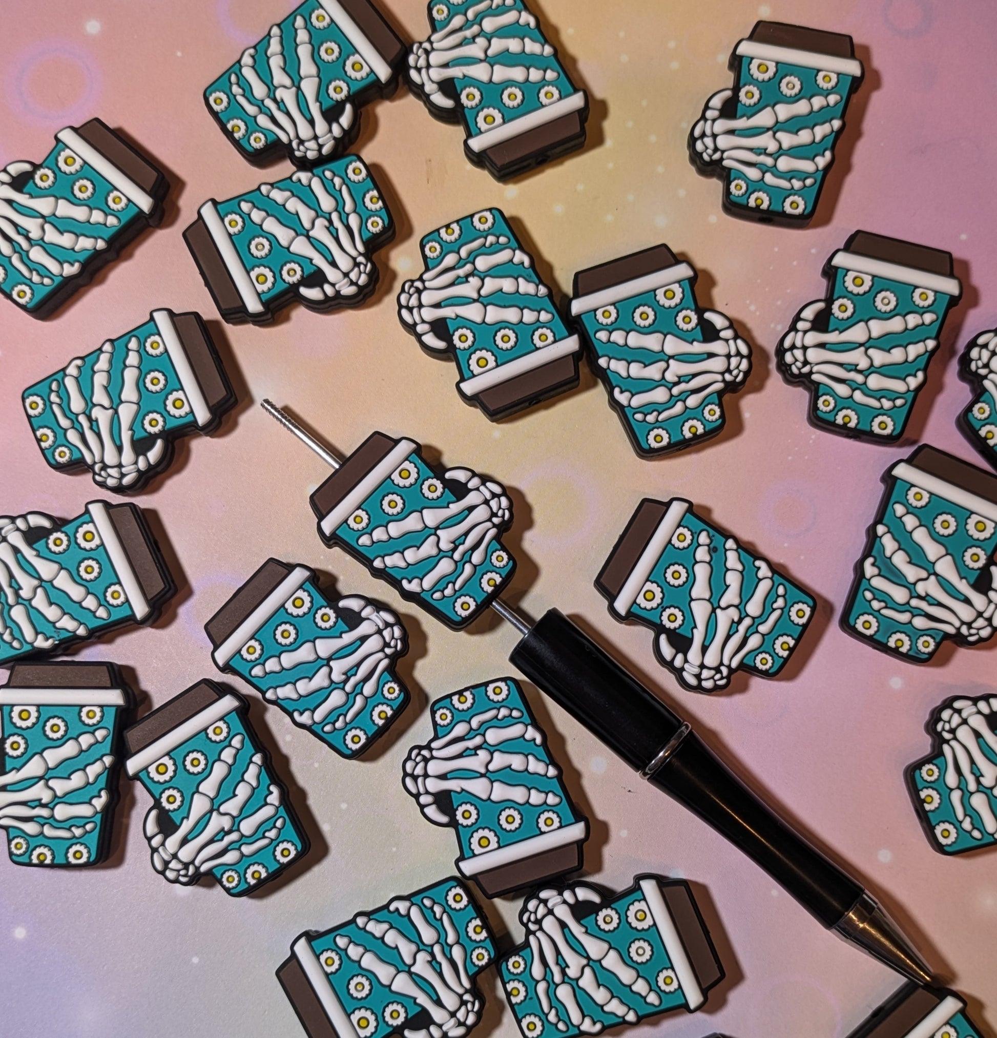 S73 Silikonperle / Focals Skellethand mit Kaffee türkis Becher mit Blumen