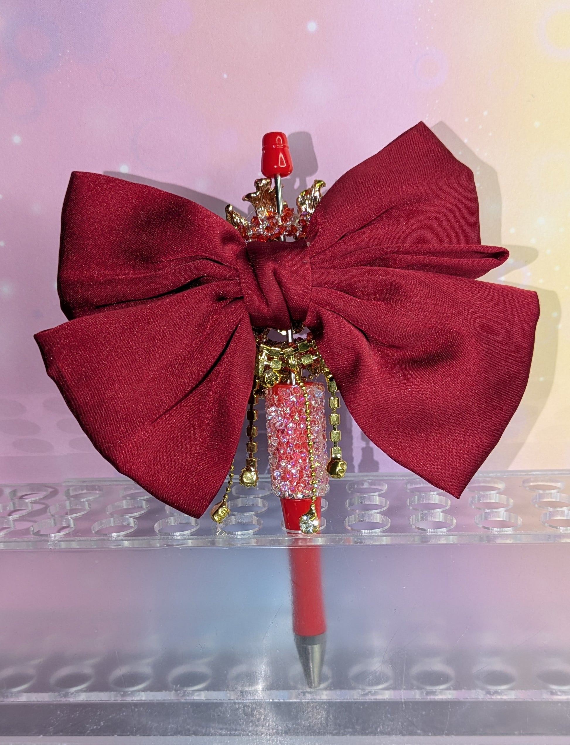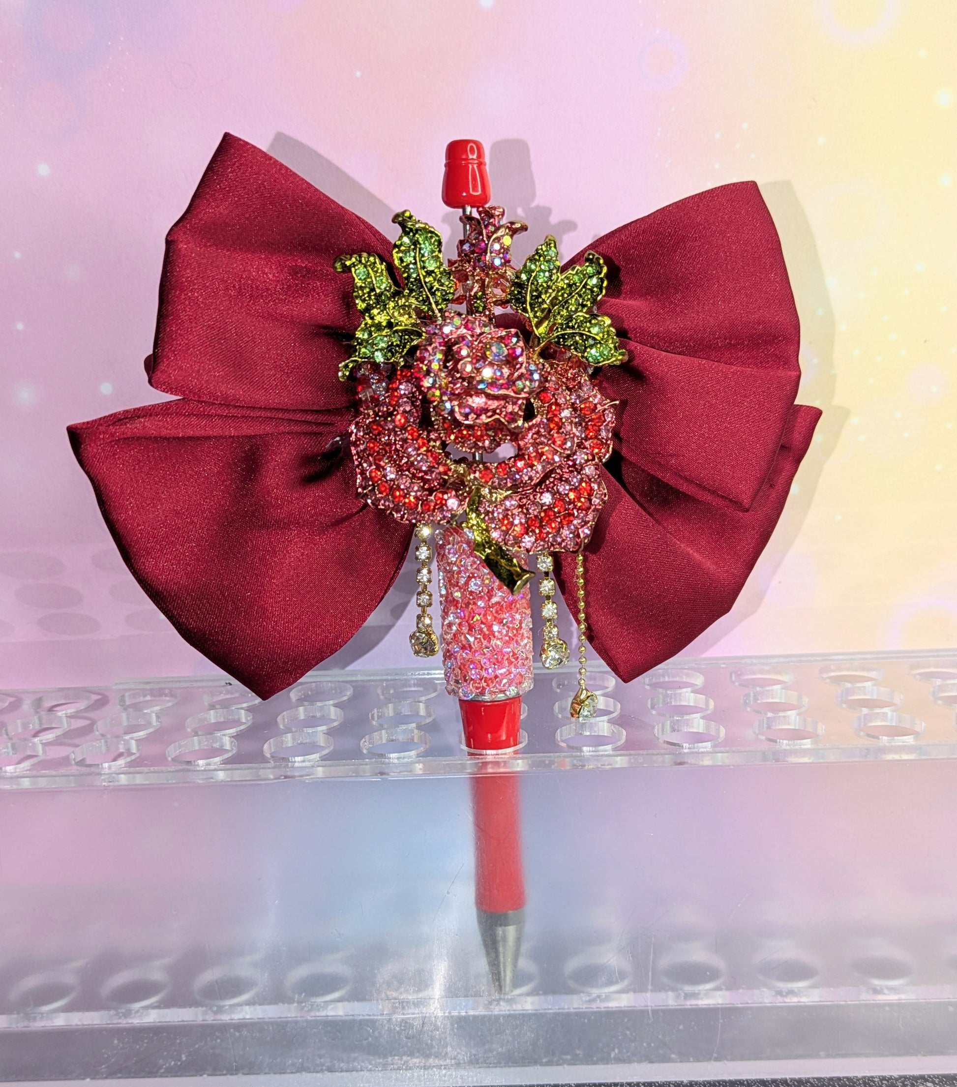 Unikat Luxeriöser Rosenblüten Kugelschreiber in rot gold und großer Samtschleife Strassbesetzt